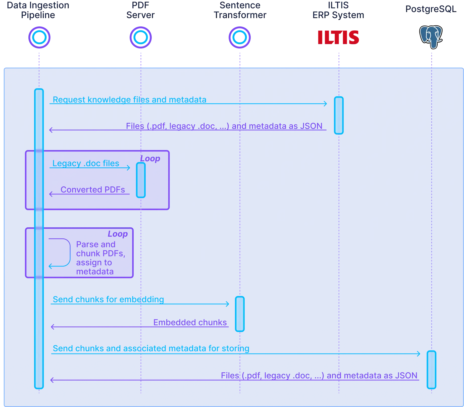 Node.js server that pulls data from the ERP, parses all PDFs, creates embeddings and checks and fills the .